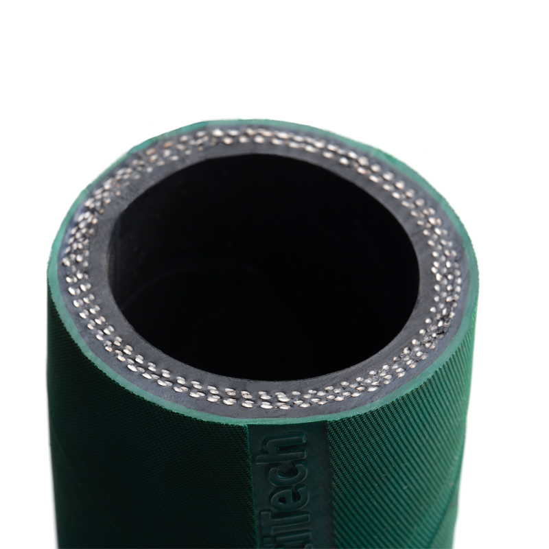 內膠:黑色的以耐高溫三元乙丙橡膠為基膠的合成橡膠Pyrosyn。外膠:黑色的和紅色的以氯磺化聚乙烯為基膠的合成橡膠Hysunite,中等耐油性(RMA的B等級),表面光滑,有針孔。增強層:一層鋼絲編織層。溫度:蒸汽輸送作業:350PSI壓力下,上限溫度325°F(163°C);熱水輸送作業:3000PSI(1/2"內徑為2500PSI)壓